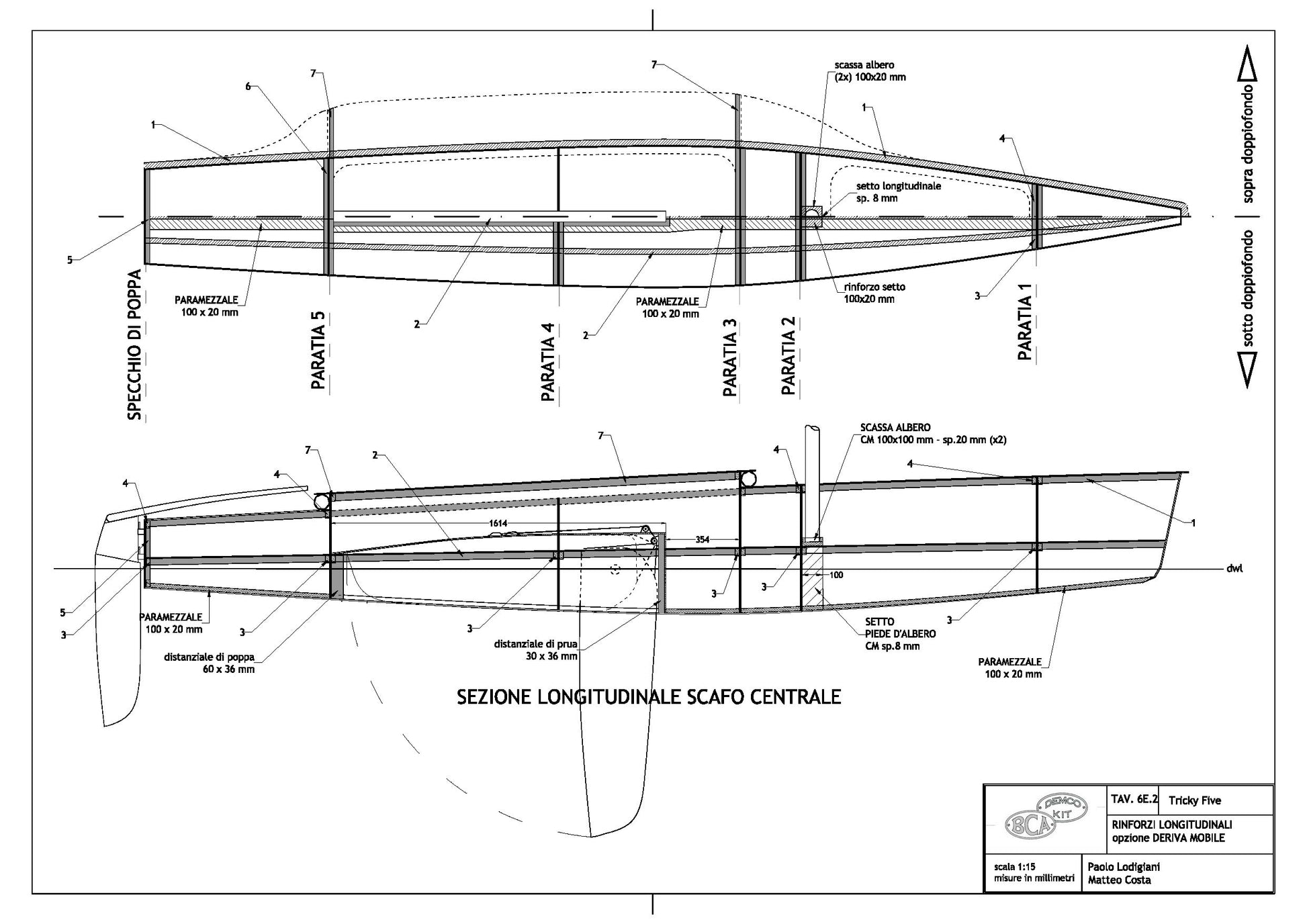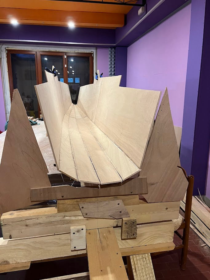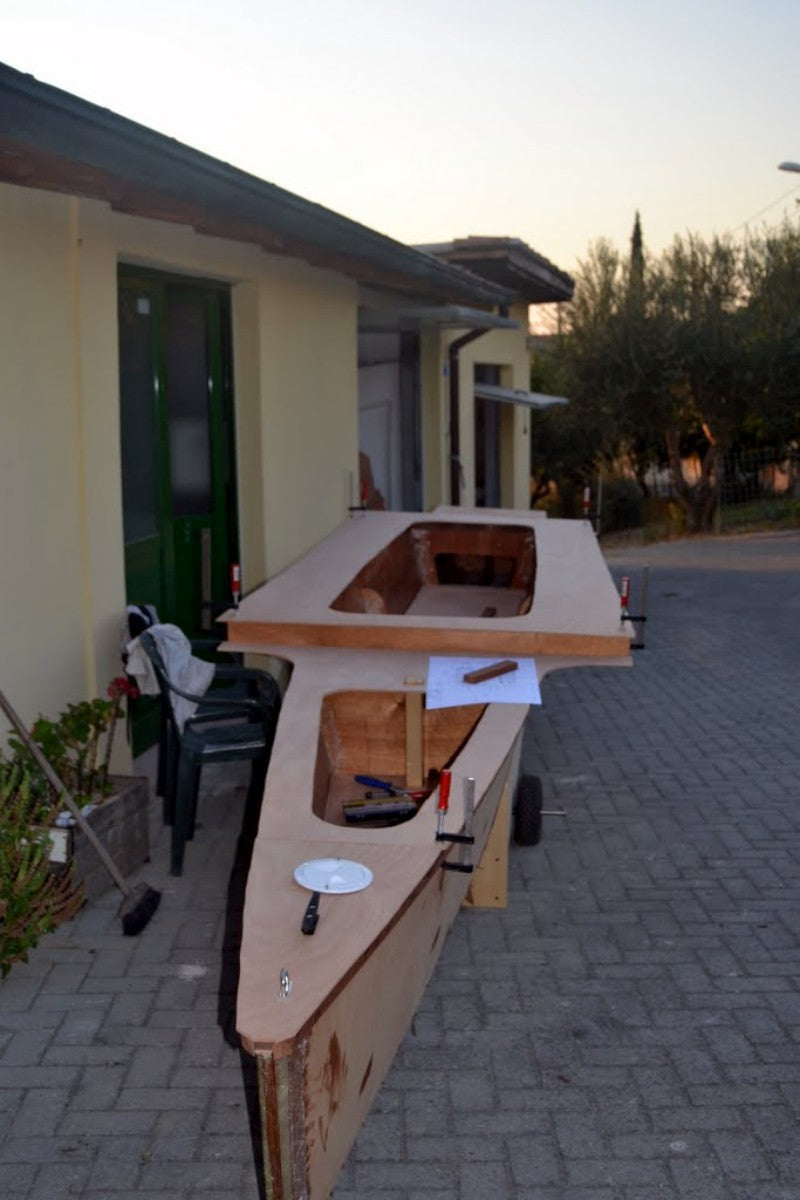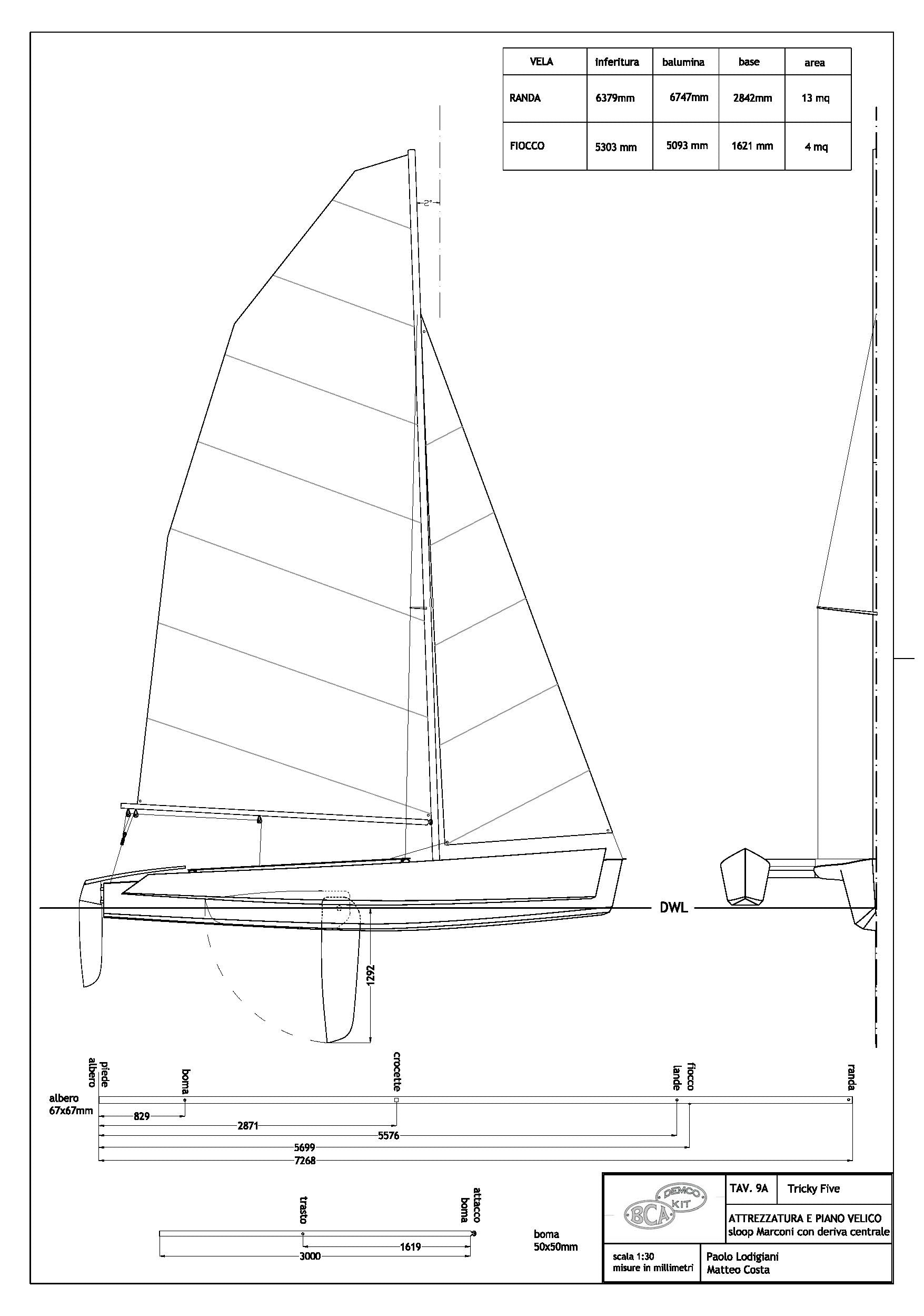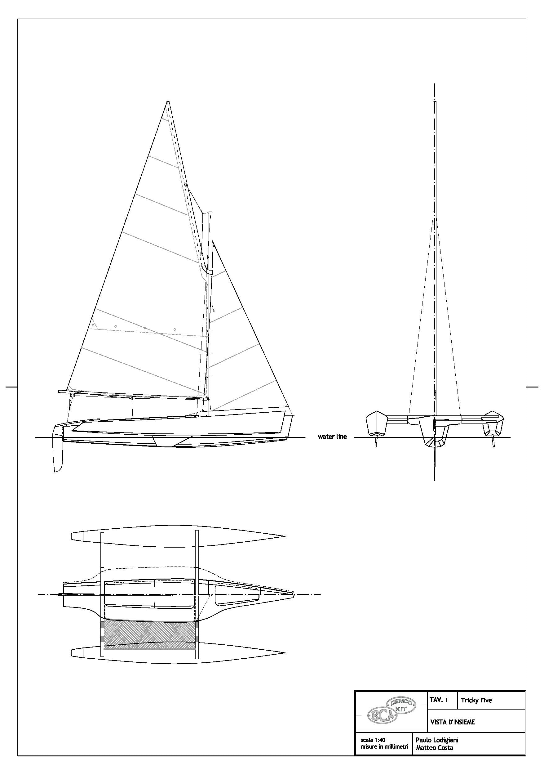 The TRICKY FIVE has been conceived for a precise scope: to realize a boat, which in relation to its size would maximize the ratio between speed and cost. This means that for a determined cost for materials and hours of construction required, it would be the fastest possible. Due to the lack of a specific index that would allow us to determine if this scope had been achieved, I had to create one myself (the Lod number, which measures the degree of economic efficiency of a boat – see box). The Nlod for TRICKY FIVE is 0.22 and we believe that it is difficult to reach a better result. This has been achieved thanks to hulls that are at the same time easy to build and efficient from the hydrodynamic point of view. The chine hull has a wetted surface slightly higher to that of a round-bilged hull and the length/width ratio is 10.3, which is very high for a trimaran of this size. The boat is not too wide, which makes it easier to manoeuvre and light. The sail area is quite large, but rather than a Marconi rigging, we have chosen a gaff rig (to be more exact, a way between the gaff rig and the gunter). This helps to keep the centre of sails low and, above all, is much more economical to build, as the spars may be built in aluminium or wood. As the main sail does not have roach, this eliminates the need for battens. For those who prefer more conventional solutions, we also afford the version with Marconi rigging, which is more expensive but undoubtedly more performing upwind. The beams are simply aluminium tubes fixed to the amas and to the main hull. Assembling is done by inserting the tube of the amas into those of the main hull. This operation takes only a few minutes. Also for the centreboard, we have chosen the simplest of solutions from the construction and manoeuvre point of view, i.e. fixed low aspect ratio centreboards mounted under the amas. It is not the ideal solution for sailing upwind and obviously, we cannot expect this boat to beat against the wind as an American Cup boat would do, but this limit is compensated by absolute speed. While sailing, the boat reaches its best and it is extremely fast and enjoyable. The construction of the TRICKY FIVE is stitch and glue and is very simple. The finishing of internal edges, the most tiresome and lengthy task of this construction technique, is reduced to the minimum, as the internal edges are hidden in the hulls or under the double bottom of the central hull. Outside, all the edges are covered with a single layer of fibreglass – which makes the hull rigid, solid and resistant to abrasion.
