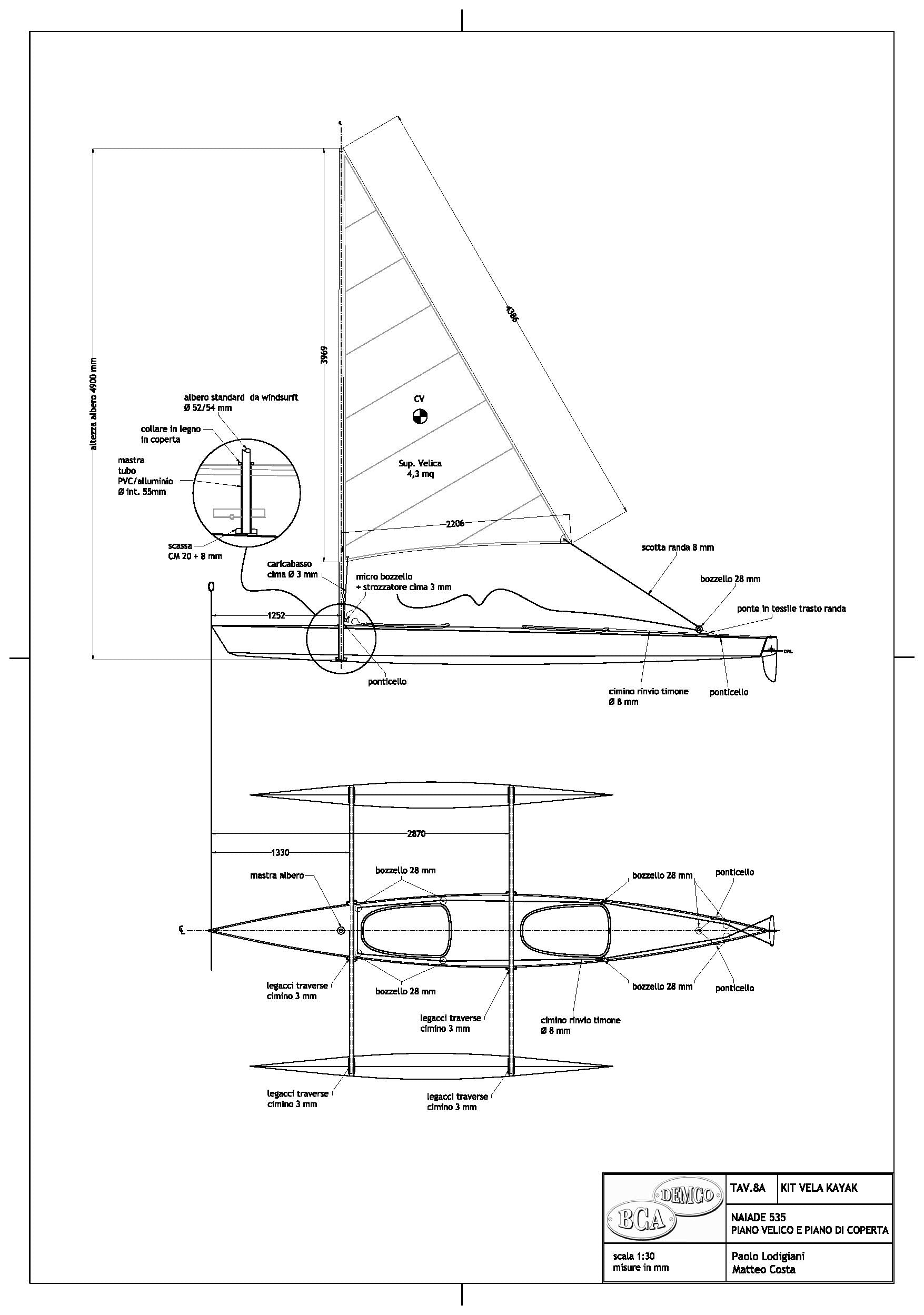 Sono previste due varianti adattabili alle canoe Naiade e Ondina (versione A) e alla canoa Ninfa (versione B). Le due versioni si differenziano per le dimensioni dei galleggianti e per la superficie velica ammessa.
