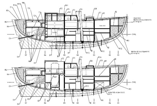 tuga, piano velico e impiantistica di un catamarano di 38 piedi disegnato dal celebre progettista inglese Wharram.