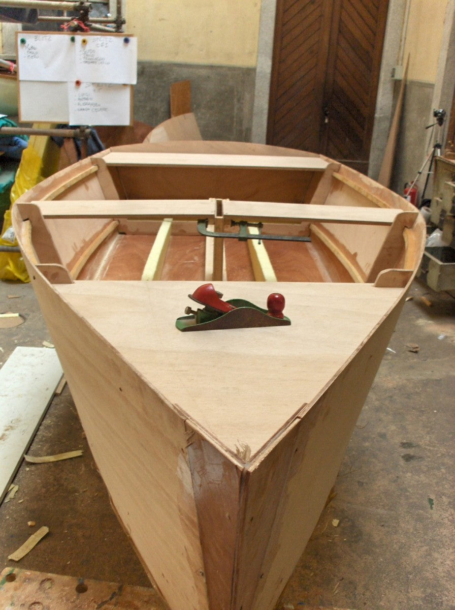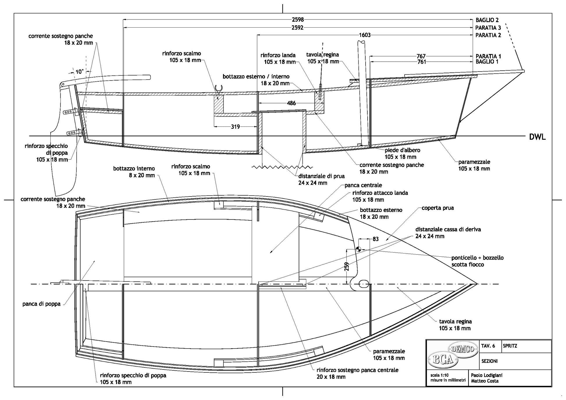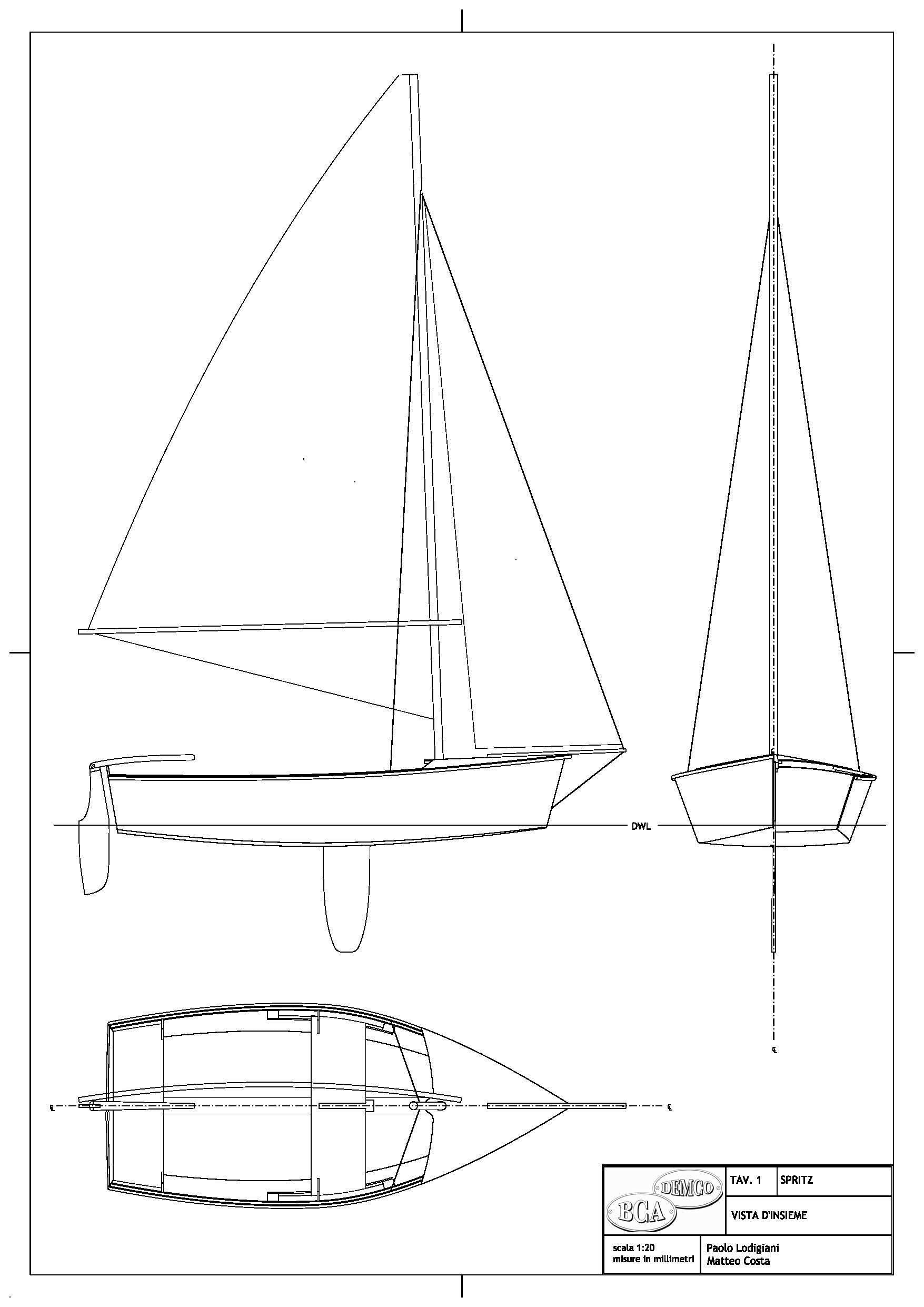 Lo SPRITZ nasce come evoluzione della nostra barca di maggior successo, il Farò, che abbiamo in produzione da quasi vent'anni e di cui nel tempo abbiamo venduto, fra piani e kit, qualche centinaio di esemplari. Il successo del Farò è dovuto al fatto che si tratta di quanto di più semplice ed economico si possa immaginare di fare con compensato marino e resina epossidica. Con lo Spritz abbiamo apportato qualche variante che complica leggermente le cose ma che ci sembra migliori il progetto. Le linee sono rimaste sostanzialmente le stesse tranne una leggera riduzione della larghezza alla linea di galleggiamento, che lo rende leggermente meno stabile del Farò, altrettanto leggermente più performante e più adatto a essere portato a remi. L'innovazione principale è l'introduzione di un doppio fondo, che rende la barca autosvuotante, facilitando il raddrizzamento in caso di rovesciamento, che era il punto debole del Farò. Inevitabilmente la costruzione è un po' più lunga e non possiamo più pubblicizzarlo, usando lo slogan coniate per il Farò, come la barca che si costruisce in un week-end. Ce ne vogliono almeno due (per un bravo costruttore che lavora con impegno), che comunque non sono molti.
