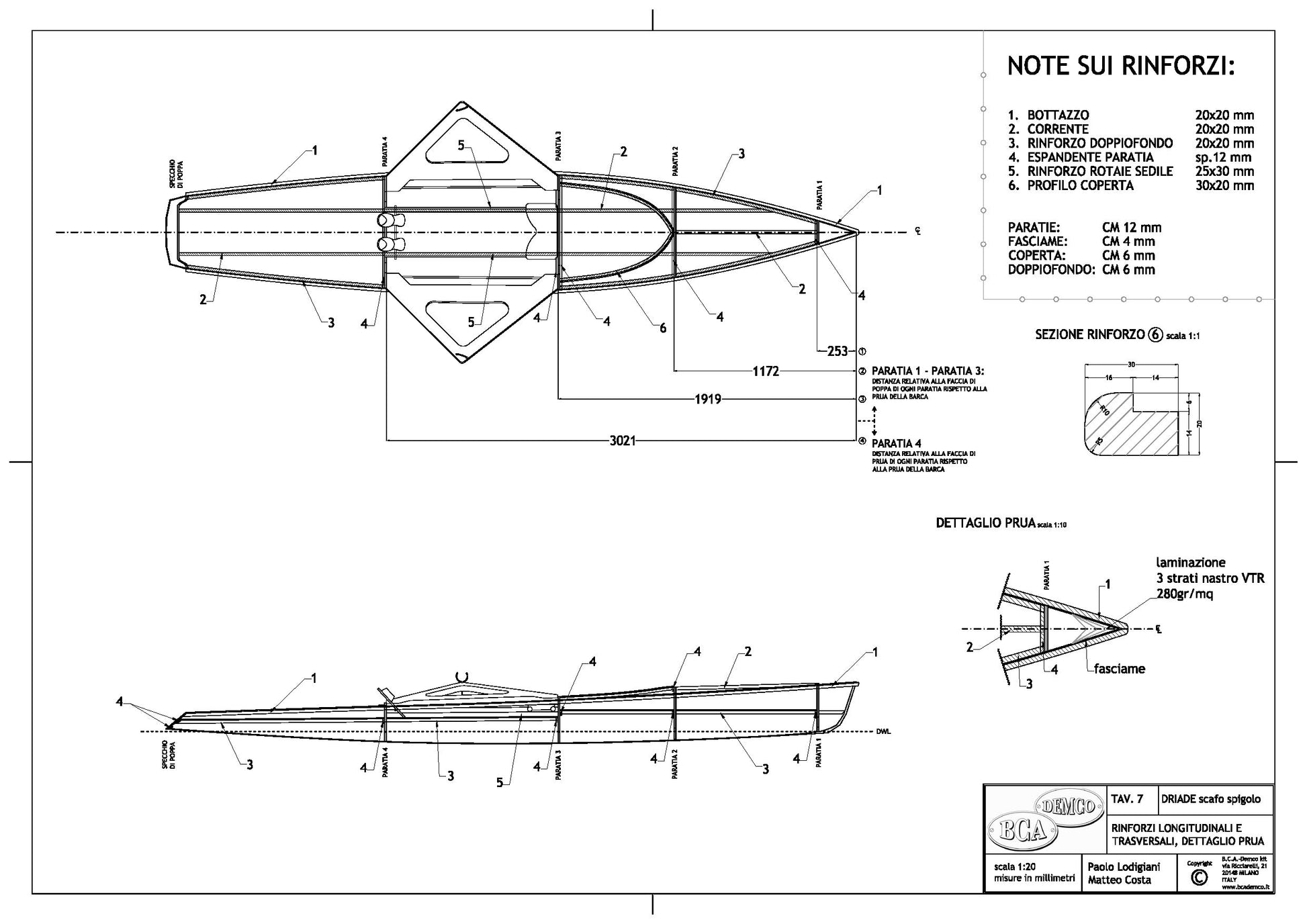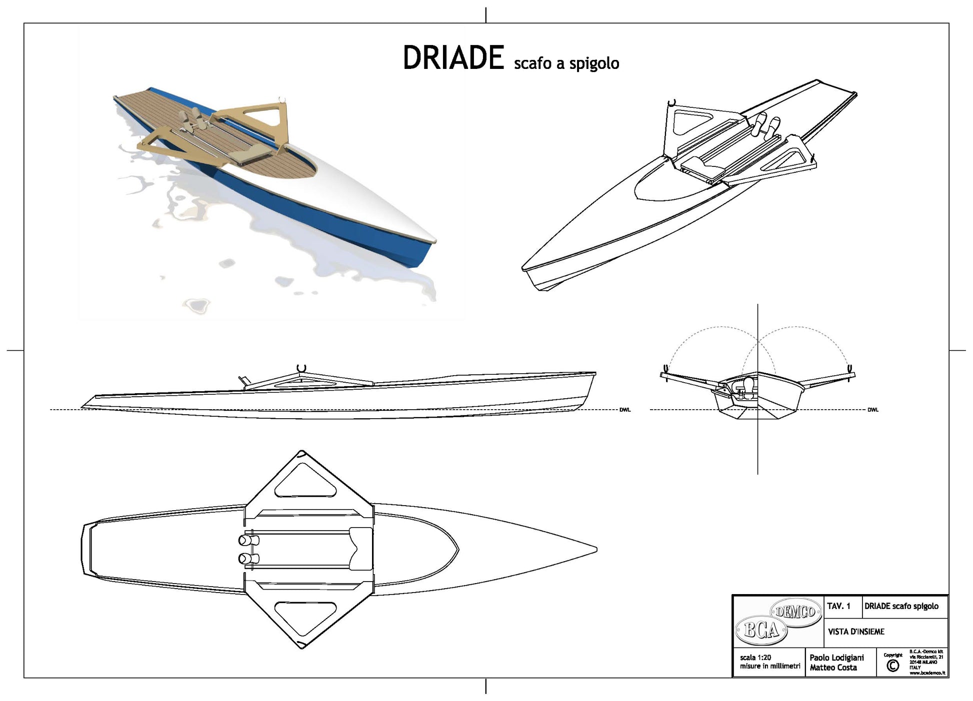Driade non si può definire una vera e propria canoa ma è piuttosto una barca da voga, ideale per chi desidera allenarsi al canottaggio con una barca più semplice, versatile, maneggevole ed economica dei classici skiff da canottaggio che sono assai più lunghi e difficili da portare. Di questi la Driade conserva alcune caratteristiche, fra cui l’uso di sedili scorrevoli e di outriggers, ma rispetto ad essi presenta il vantaggio di essere facilmente trasportabile sul tetto di un’autovettura media. La barca è abbastanza stabile da prestarsi anche ad un uso turistico, benché non sia questo lo scopo da cui nasce. La velocità, che è strettamente connessa alla lunghezza al galleggiamento, non è quella di una vera imbarcazione da canottaggio ma grazie alle linee affinate, alla leggerezza e all’efficienza della remata essa è assai più rapida di una normale barca a remi di pari dimensioni. La versione a spigolo e quella tonda hanno caratteristiche del tutto analoghe.