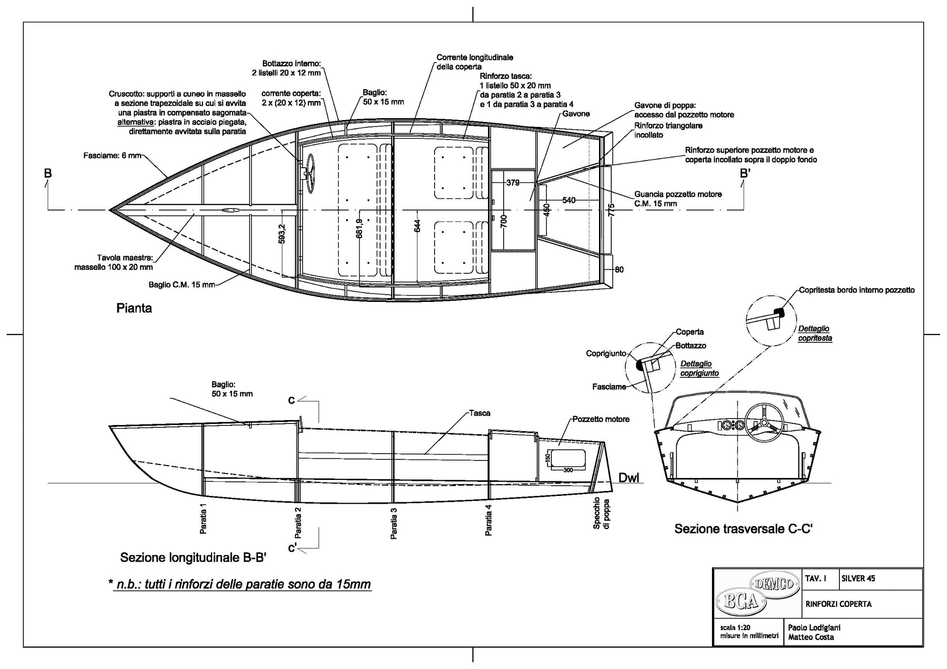Queste forme si sposano perfettamente con l’uso del compensato marino e questo consente di realizzare i SILVER con un sistema assimilabile al cuci e incolla, ossia evitando la necessità di fare il dormiente di spigolo in legno che, per essere eseguito a regola d’arte, richiede capacità abbastanza elevate. I SILVER non sono delle “instant boats” e la costruzione richiede tempi abbastanza lunghi ma non presenta difficoltà insormontabili nemmeno al costruttore privo di precedenti esperienze. Il pannello del fondo ha una curvatura piuttosto elevata e per ottenerla abbiamo optato per un compensato abbastanza sottile che deve essere rivestito esternamente con tessuto di fibra di vetro. Le fiancate invece non sono rivestite in modo da poter essere finite con vernice trasparente con legno a vista. Il SILVER 45 è la dimensione minima possibile per un motoscafo di questo tipo mentre il SILVER 55 già offre più spazio e la possibilità di avere, a poppa del posto di guida, un pozzetto abbastanza ampio trasformabile in prendisole. La motorizzazione consigliata è di 25/40 HP per il SILVER 45 e 40 HP per il SILVER 55, una motorizzazione che consente di rimanere entro i limiti della guida senza patente ma che permettere di planare anche a pieno carico. La barca è inaffondabile essendo la parte di prua stagna (con funzione di crash-box) ed essendo previsto un doppio fondo sotto al quale ci sono dei compartimenti stagni riempiti di espanso.