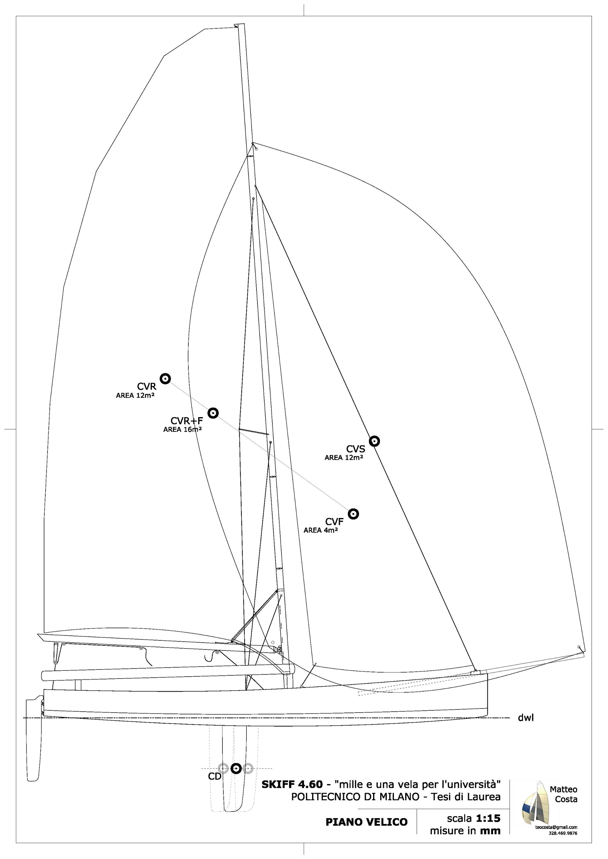 In fase di progetto si è cercato il giusto compromesso tra propensione alla planata, governabilità, stabilità e riduzione degli attriti: uno skiff spiccatamente planante, che richiede un equipaggio esperto, con le linee d’acqua della carena studiate per staccare prima possibile lo scafo dall’acqua, caratterizzate da una leggera V nell’estremità di prua, a forma quasi piatta e spigolo di separazione fra la carena e le fiancate dalla deriva a poppa, minima superficie bagnata, sezione massima piuttosto spostata verso poppa, specchio di poppa troncato in modo netto, coperta che non intralci i movimenti repentini dell’equipaggio in regata, terrazze sporgenti di quasi mezzo metro.