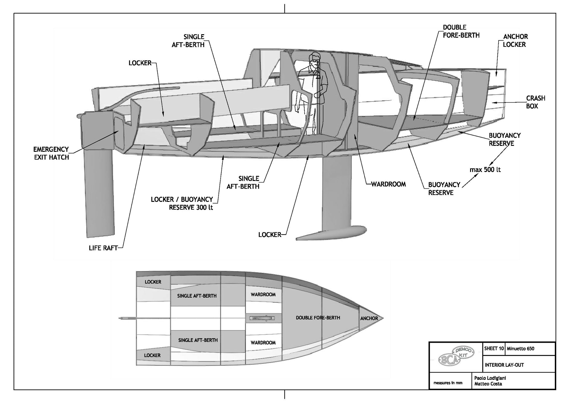 Le differenze più vistose fra i due sono la larghezza massima (3 m, ossia il massimo ammesso dai regolamenti, per la versione più spinta e 2,50 m, in modo da consentire il trasporto con carrello, per la versione più tranquilla) e la superficie velica (38 m2 la versione regata, 32,8 m2 la versione crociera). Anche il minisprint, pur essendo capace di prestazioni esaltanti e di emozionanti planate, non è disegnato con l'intento di poter competere con i mostri della classe, che adottano soluzioni tecniche assai più sofisticate, ma solo con quello di non sfigurare troppo confrontandosi ad essi. Anche il versione crociera può partecipare all'attività agonistica della classe, rientrando appieno nelle regole di stazza, ma ha qualche chance solo in condizioni meteo favorevoli, con venti medio-deboli e senza lunghi lati al lasco. La chiglia è in entrambe le versioni sollevabile con un paranco manovrabile dal pozzetto. Il siluro in piombo posizionato molto in basso, unito alla zavorra mobile ad acqua, consente di portare una notevole superficie velica. Gli interni sono spartani ma abbastanza spaziosi con sistemazioni previste per 4 persone. La costruzione è con il metodo cuci e incolla in CM e epossidica, con molti rinforzi in fibra di vetro (o eventualmente carbonio) nelle aree più sollecitate: tutto è stato pensato per essere il più rapido e semplice possibile e Il sistema è alla portata di dilettanti con modesta esperienza ed è assai rapido, soprattutto se non si aspira ad un livello di finitura molto elevato.