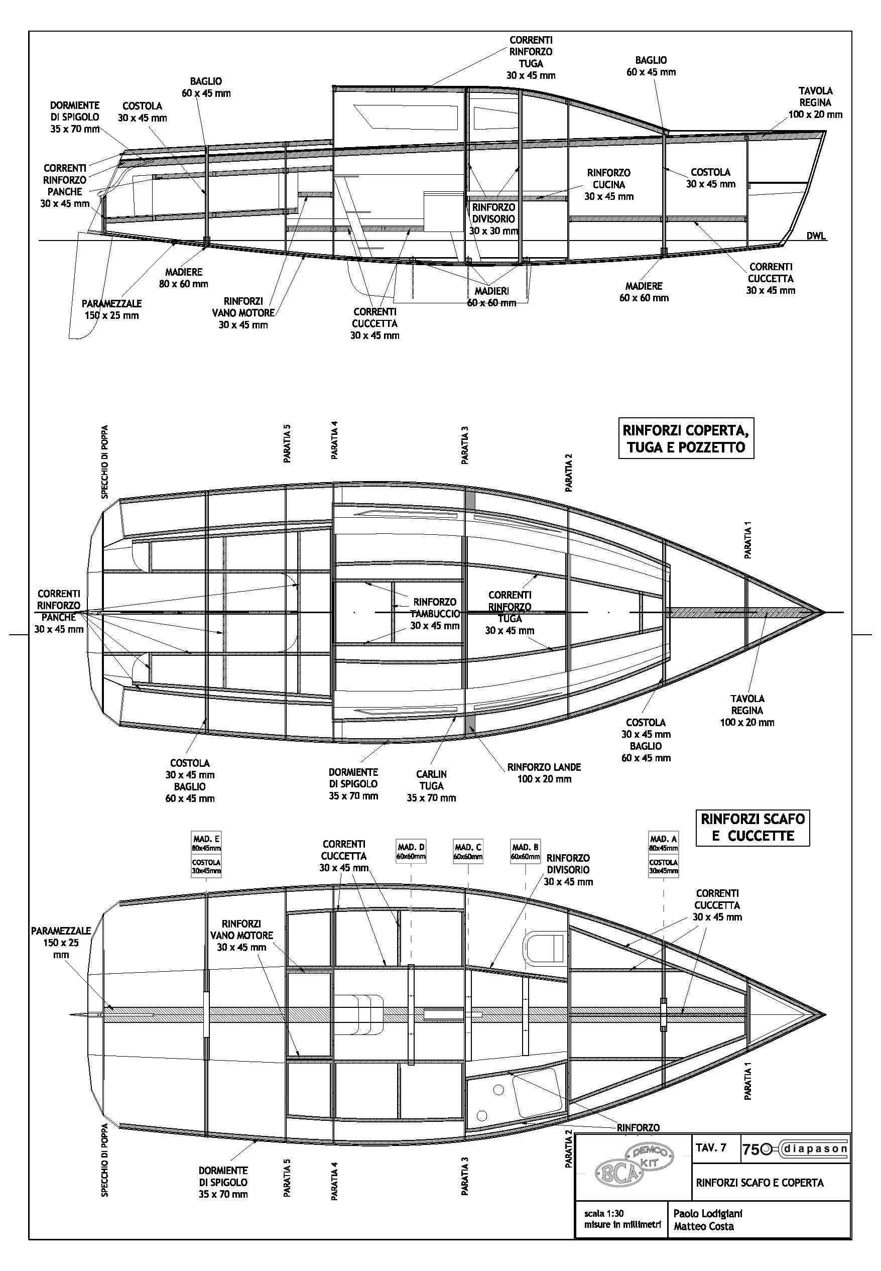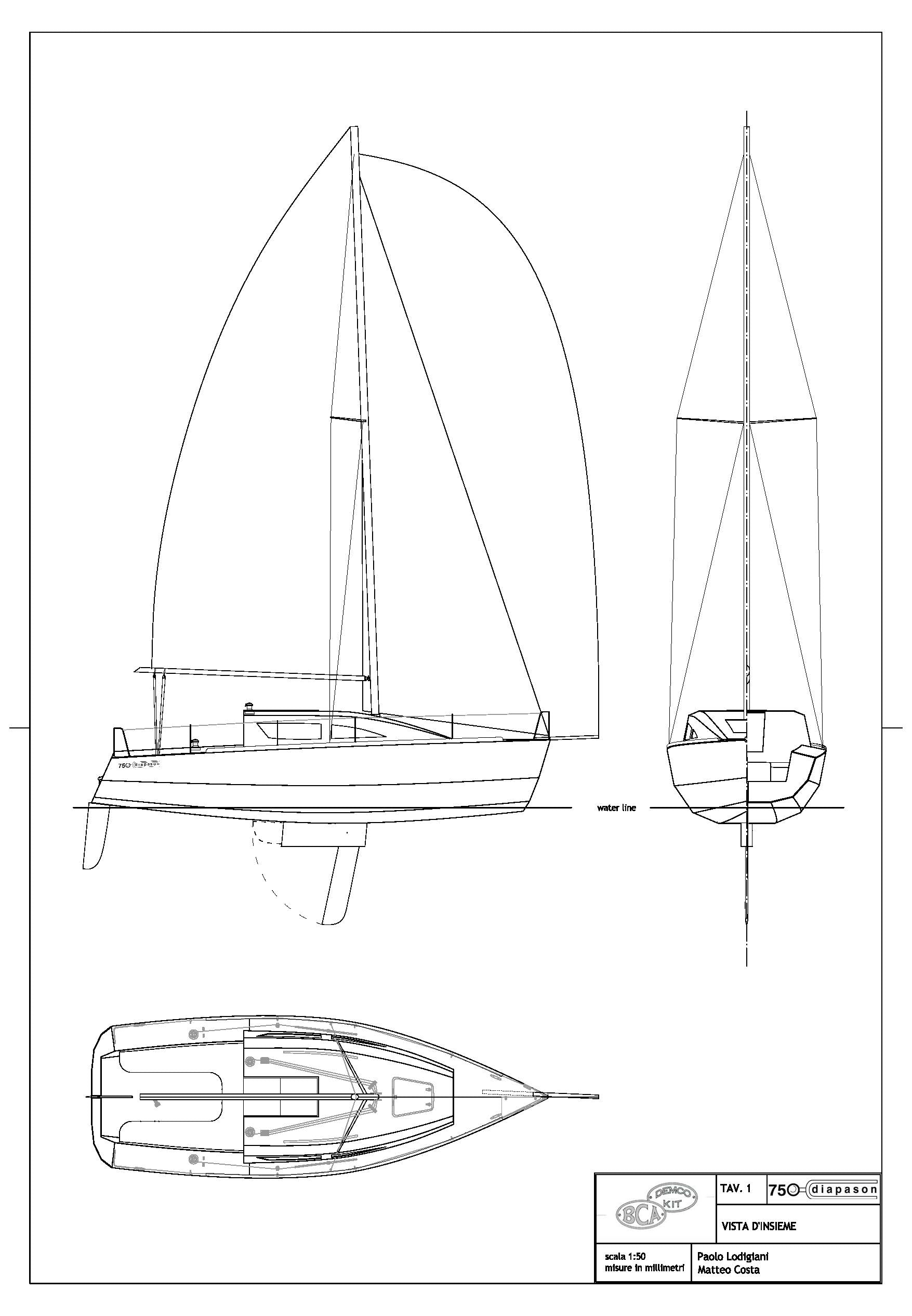 7,50 m di lunghezza è per un piccolo cabinato una dimensione che presenta un grande vantaggio e alcuni inconvenienti. Il vantaggio è che si tratta della dimensione-limite entro cui si può realizzare un cabinato carrellabile senza forzarne troppo le caratteristiche. Al di là di questa lunghezza è abbastanza difficile disegnare una barca la cui larghezza e il cui peso rientrino nei limiti della carrellabilità. Per contro gli inconvenienti sono che la barca manca ancora di quello spazio interno per offrire il comfort di una vera barca da crociera, ossia l’altezza d’uomo in quadrato, un buon bagno separato, un cucinino come si deve. Basterebbe un metro di più e tutte queste cose troverebbero facilmente una loro collocazione. Il risultato è che molte barche di queste dimensioni sono un ibrido che cerca di mettere d’accordo caratteristiche fra loro incompatibili. Anche nel Diapason 750 naturalmente si è cercato qualche compromesso e accomodamento ma senza forzare eccessivamente le cose. Abbiamo preferito accettare le limitazioni implicite nella dimensione piuttosto che ricorrere a soluzioni che non ci convincevano dal punto di vista progettuale o estetico. Per esempio avremmo potuto ottenere in cabina l'altezza d'uomo adeguata aggiungendo una ventina di centimetri alla tuga.